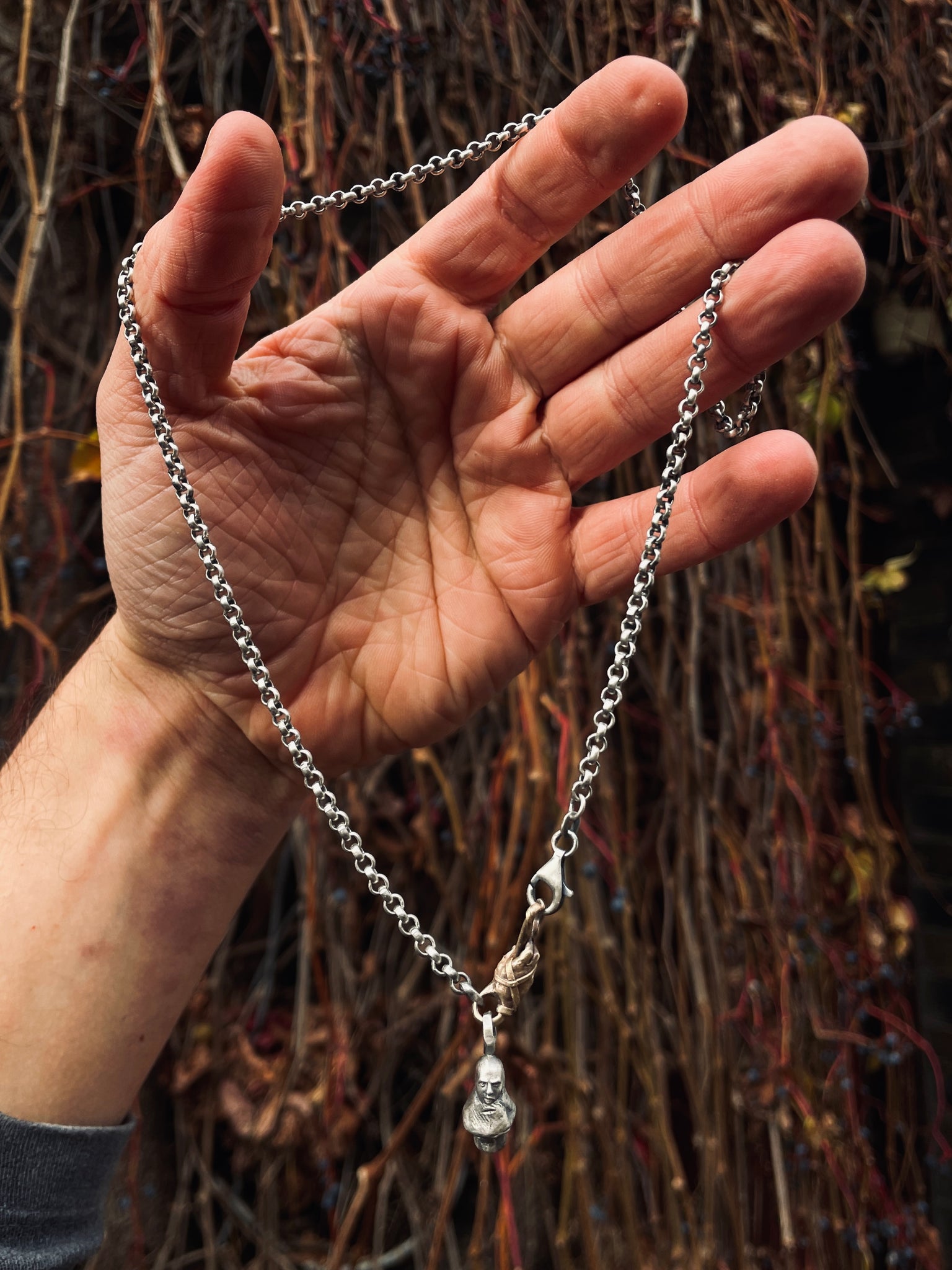 Handmade by Fraser Hamilton, this silver chain has a delicately carved and wrapped gold hand latching on to the clasp and securing a floating plug head rendered in silver.