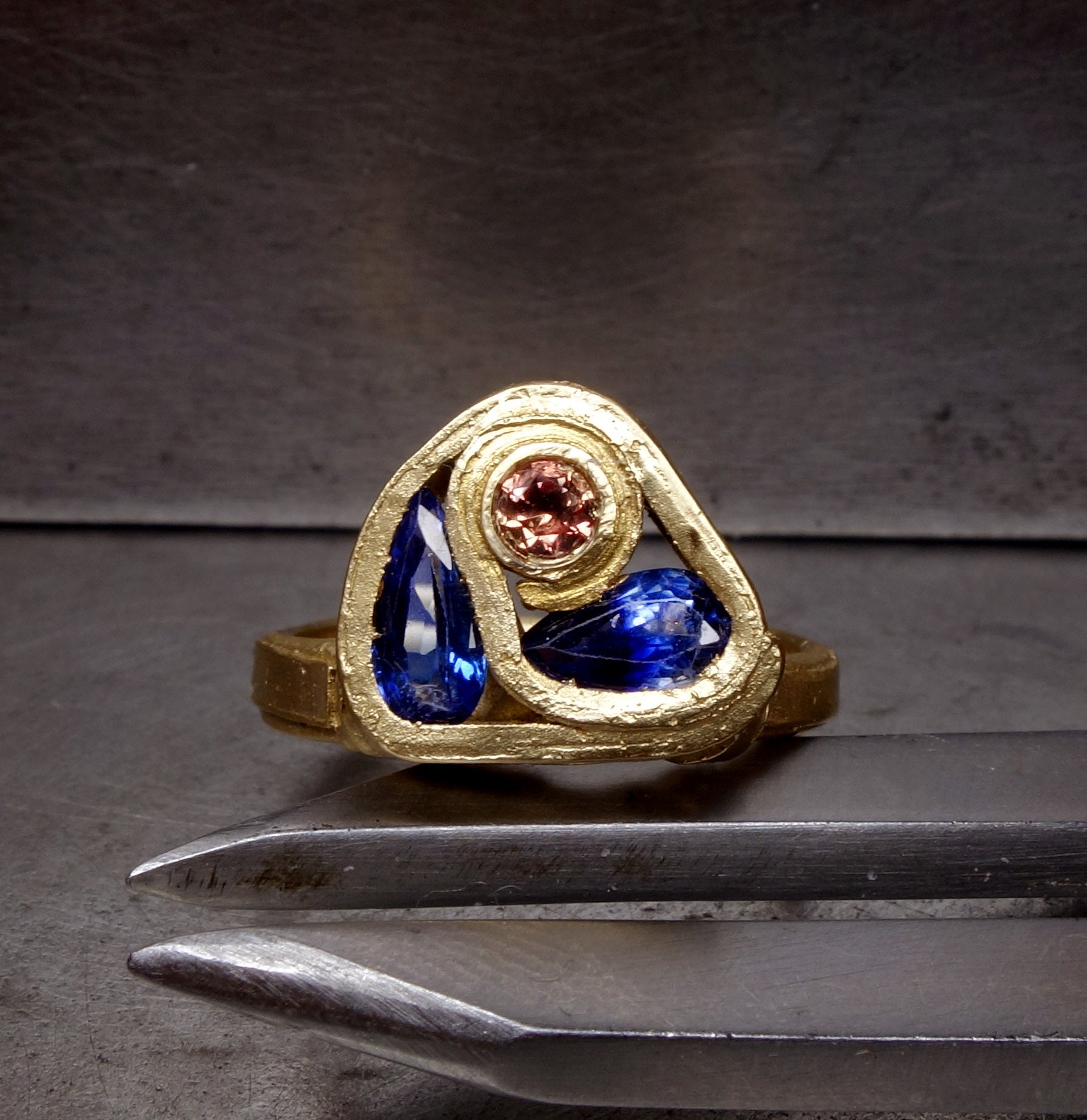 Handmade by Fraser Hamilton - a coil of gold encases three natural sapphires. This ring is one of a kind and currently a size L1/2 or a 6 US - it can be sized up or down to the sizes listed
