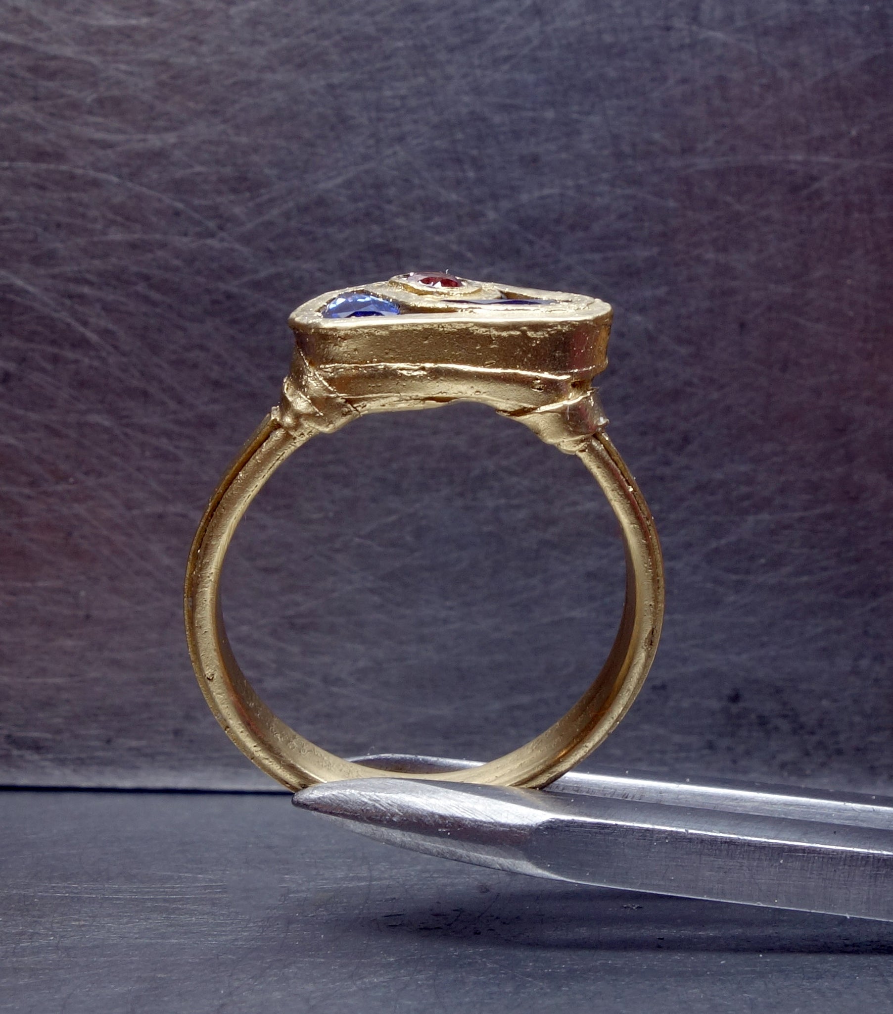 Materials | 14k yellow gold, 2 sapphires totalling 1.14ct and a 0.34ct orange natural Malawi sapphire