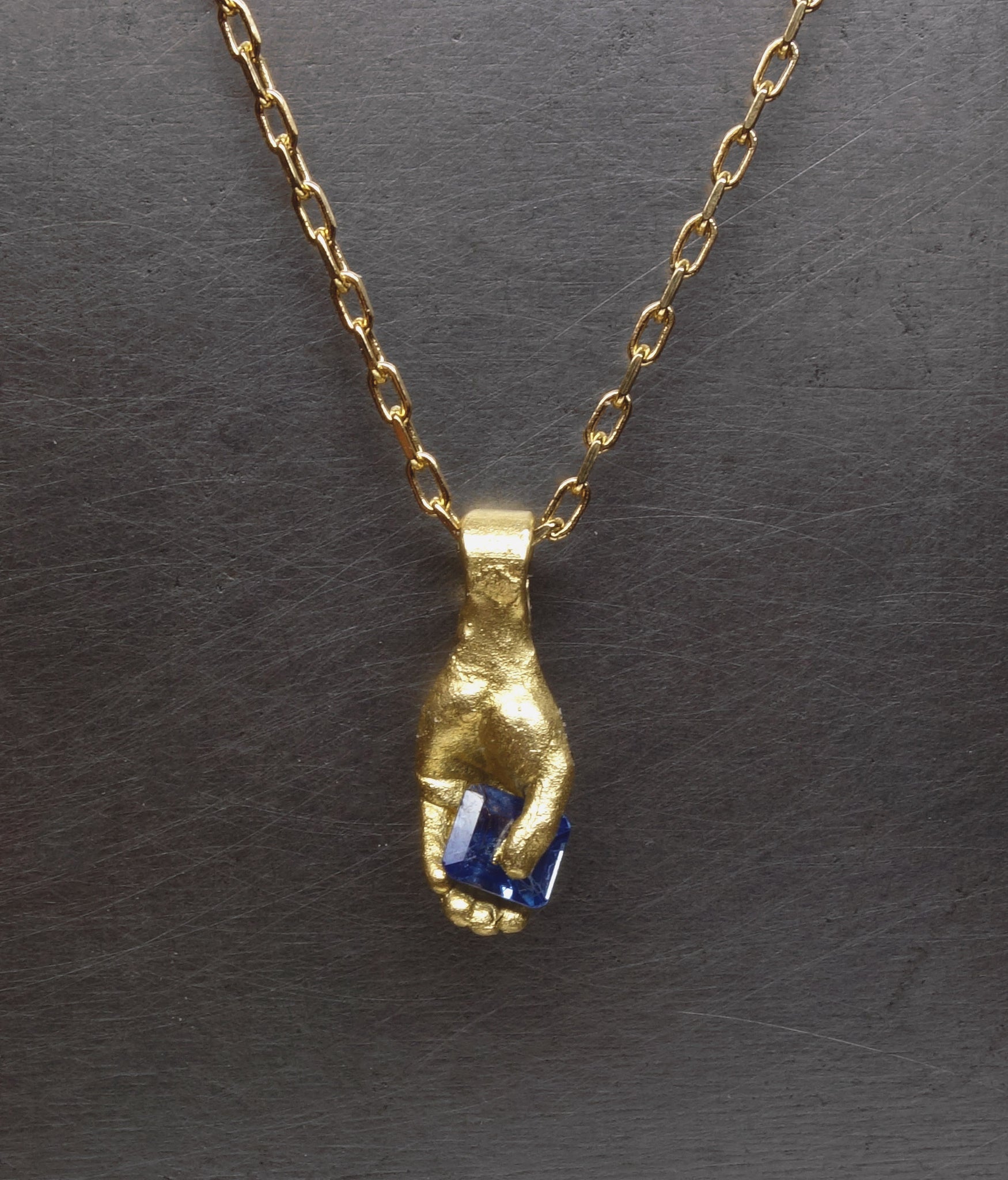 Handmade by Fraser Hamilton, the Hand Pendant, a finely-detailed hand clasps an exquisite natural sapphire and presents it to the beholder. Available now and ready to ship. Each pendant is unique with subtle differences in the angle shape and colour of the gemstone.