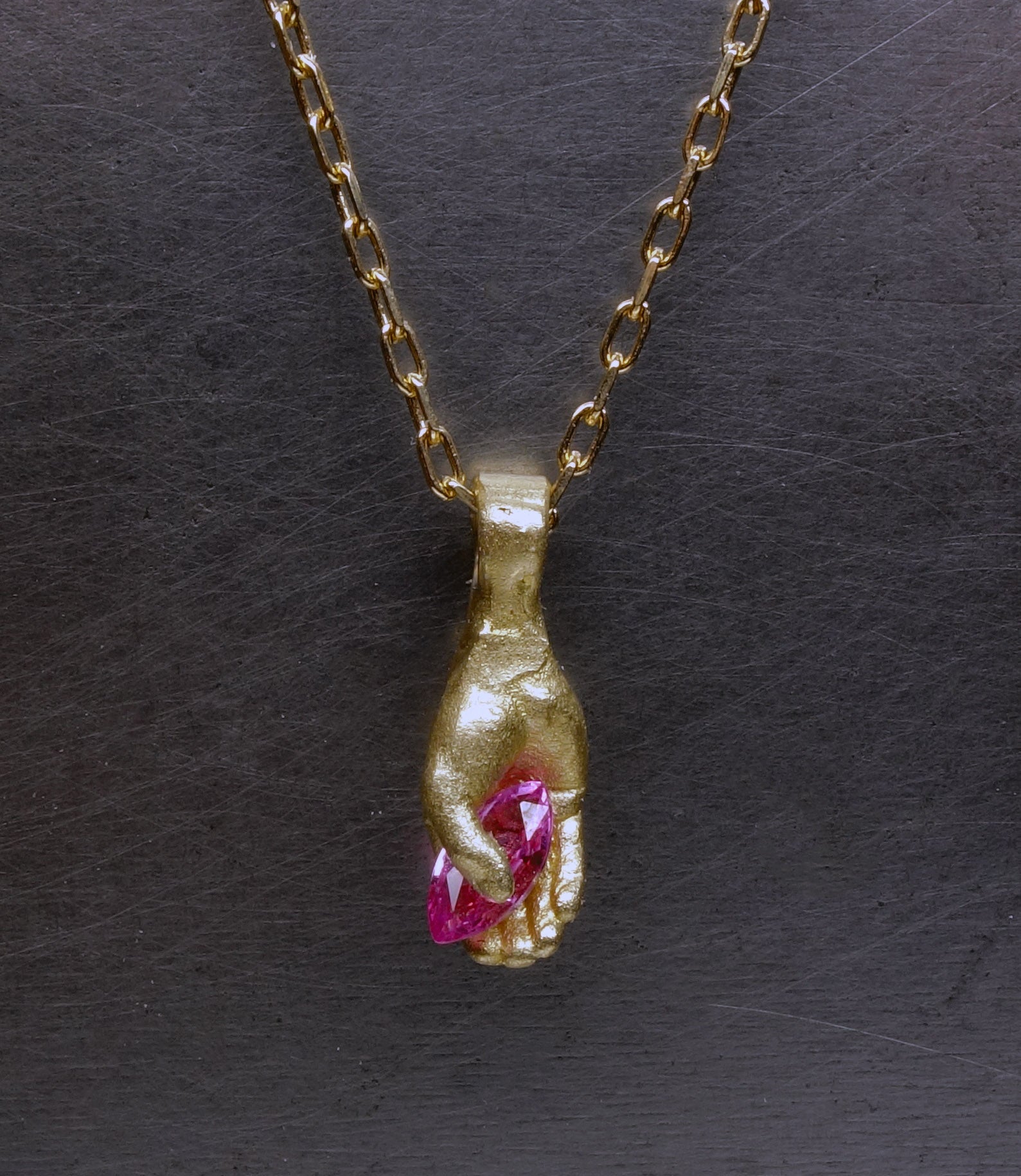 Handmade by Fraser Hamilton, the Hand Pendant, a finely-detailed hand clasps an exquisite natural sapphire and presents it to the beholder. Available now and ready to ship. Each pendant is unique with subtle differences in the angle shape and colour of the gemstone.