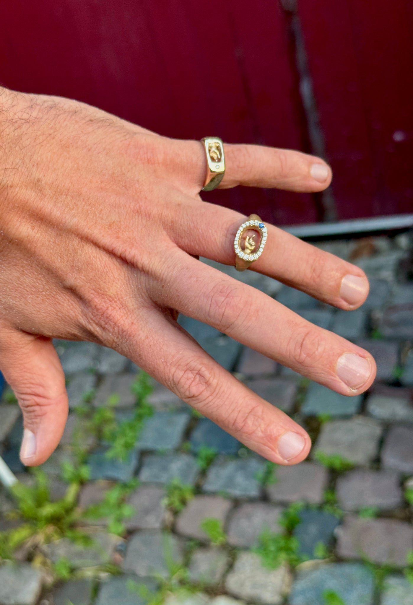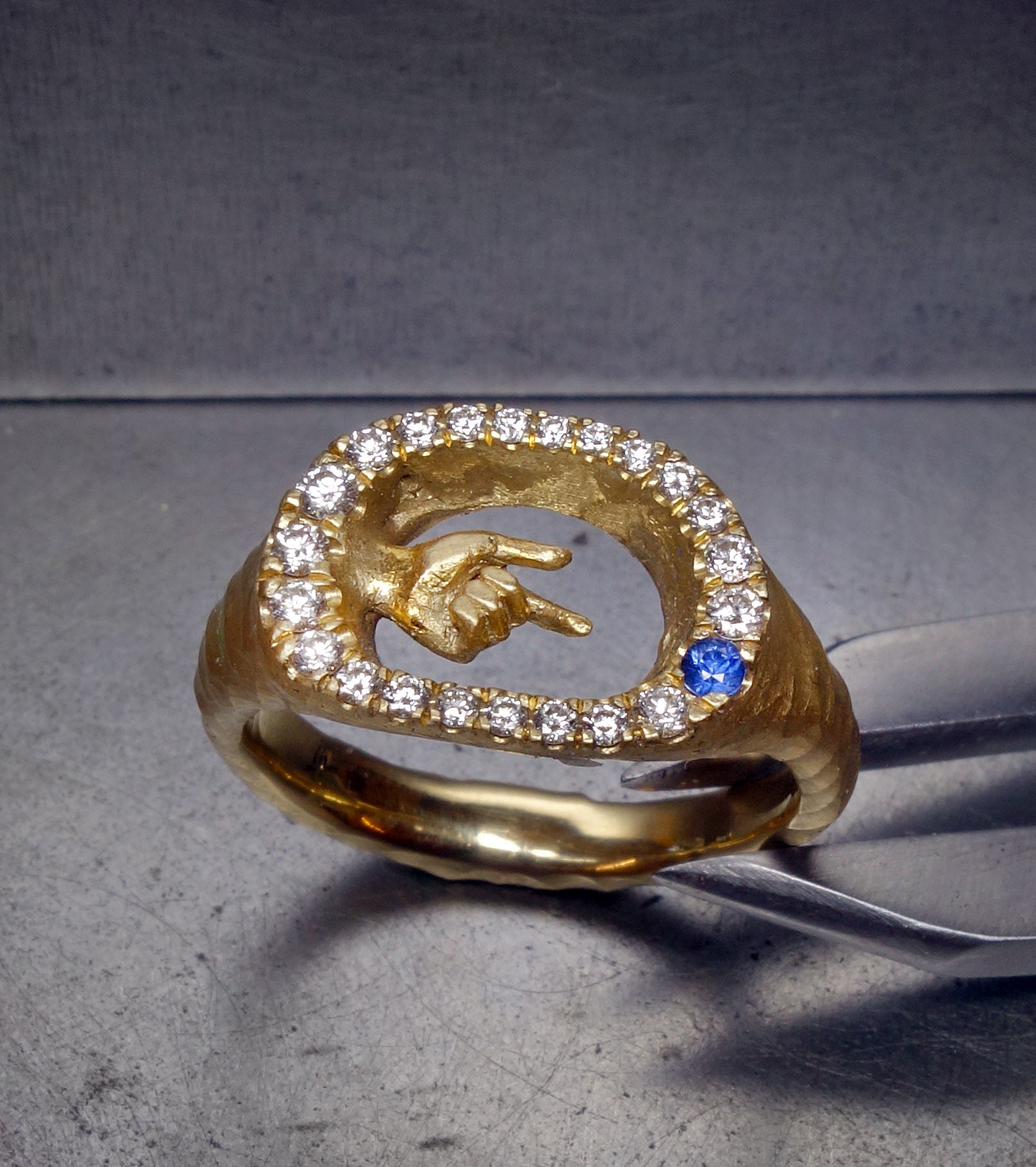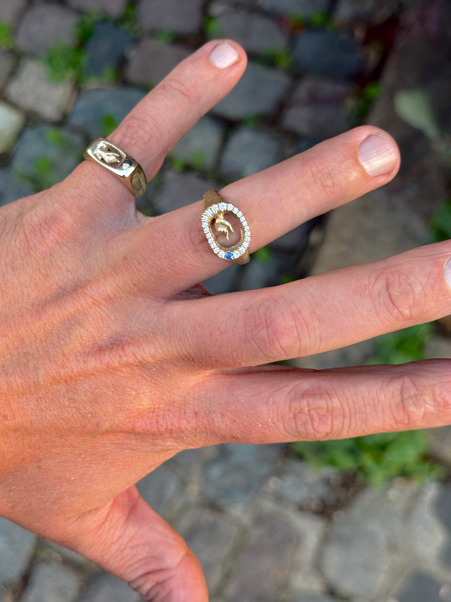 Materials | 9k yellow gold, 0.32ct diamonds, Natural blue sapphire.