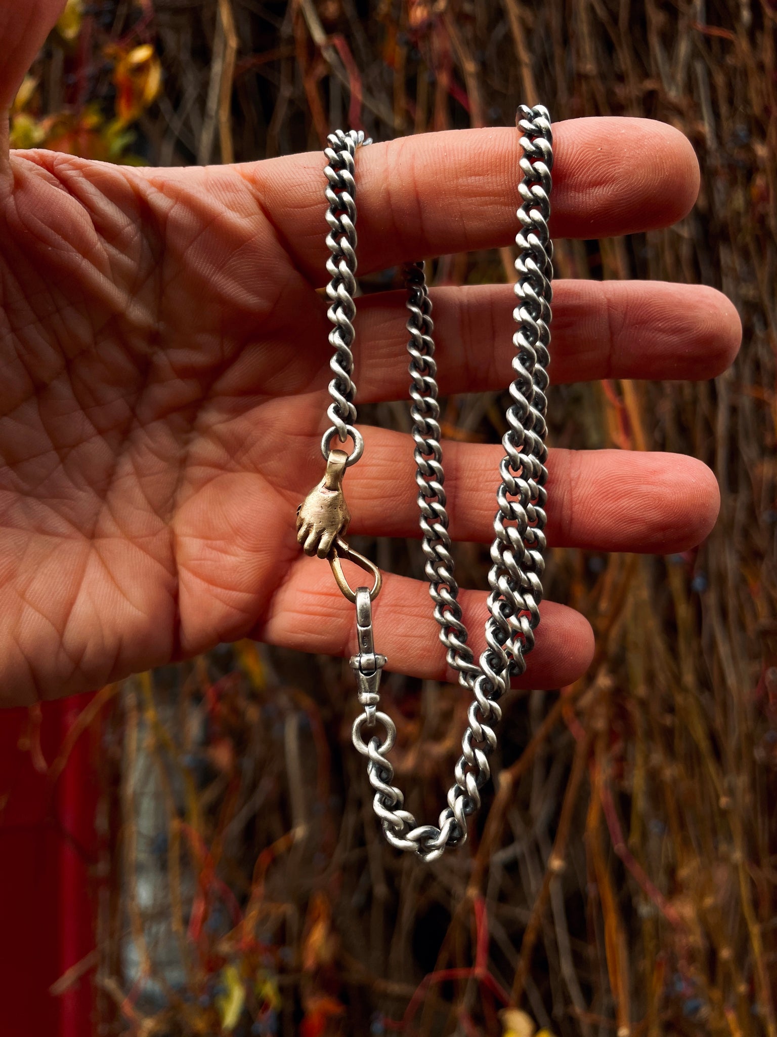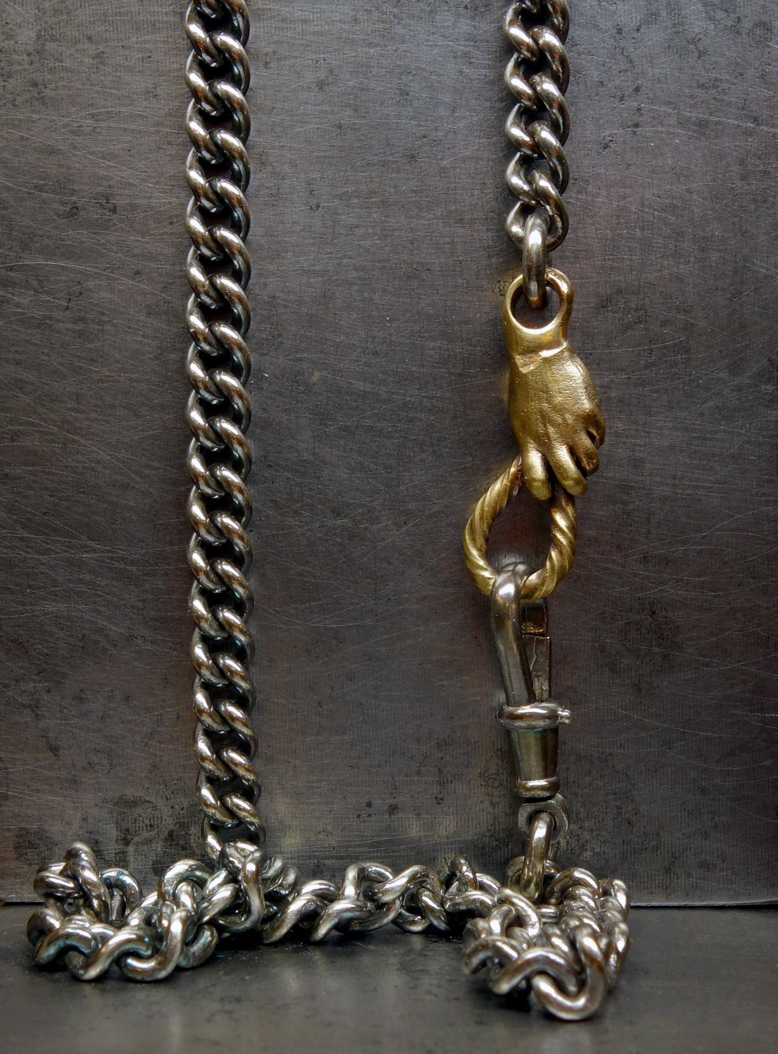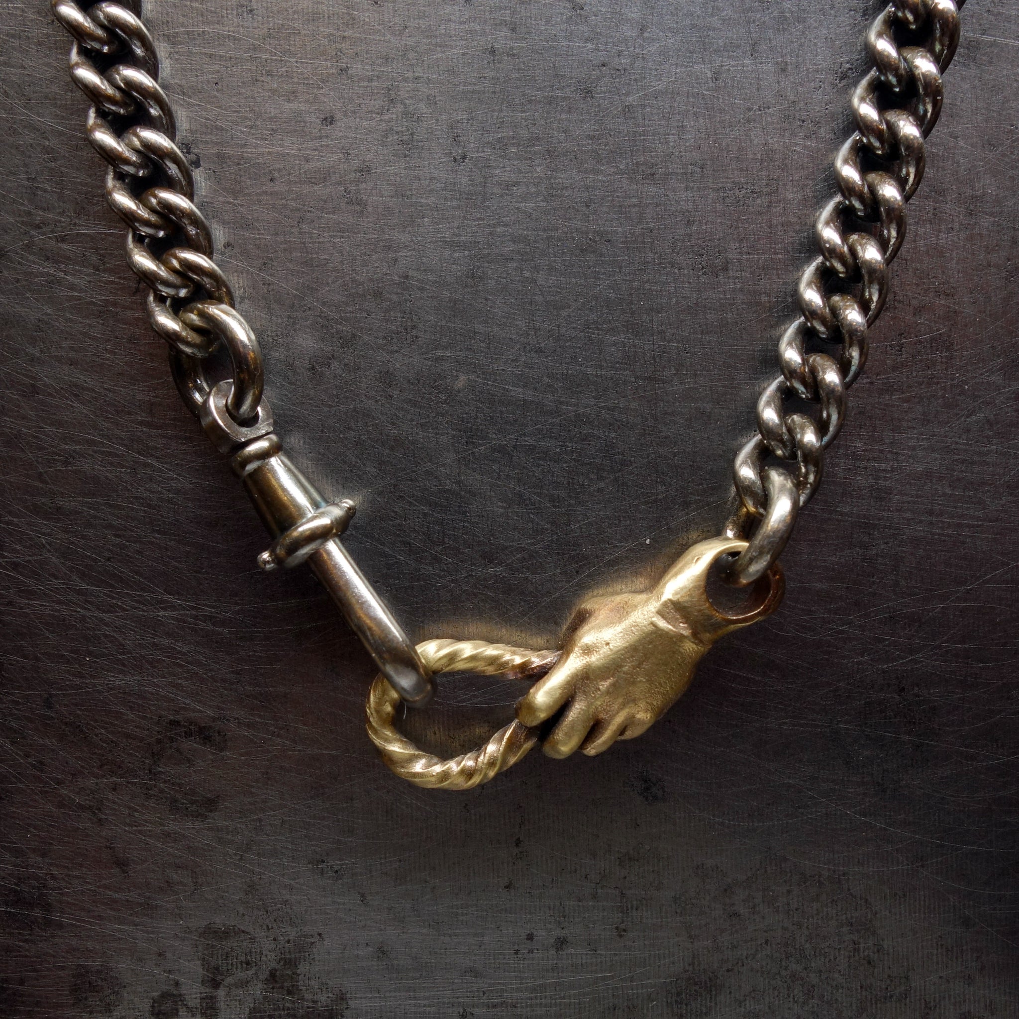 Handmade by Fraser Hamilton, a luxe heavy weight bracelet with a solid gold hand grasping the connecting rings. Do get in touch if you would like to discuss something more bespoke.