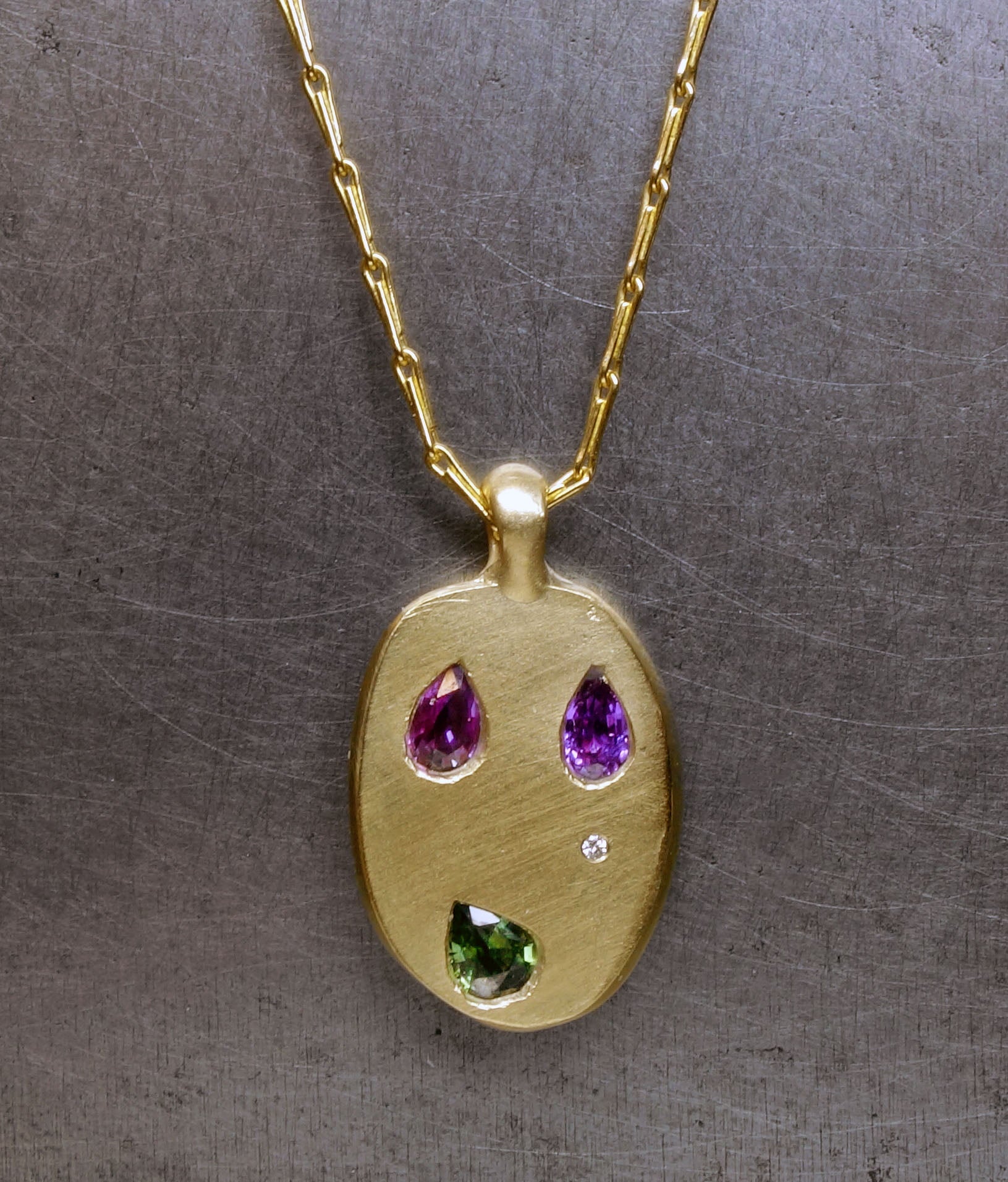 Handmade by Fraser Hamilton, this pendant is a very new sapphire mask featuring a unique anthropomorphic arrangement of three unique sapphires and a rare tear in the form of a diamond.