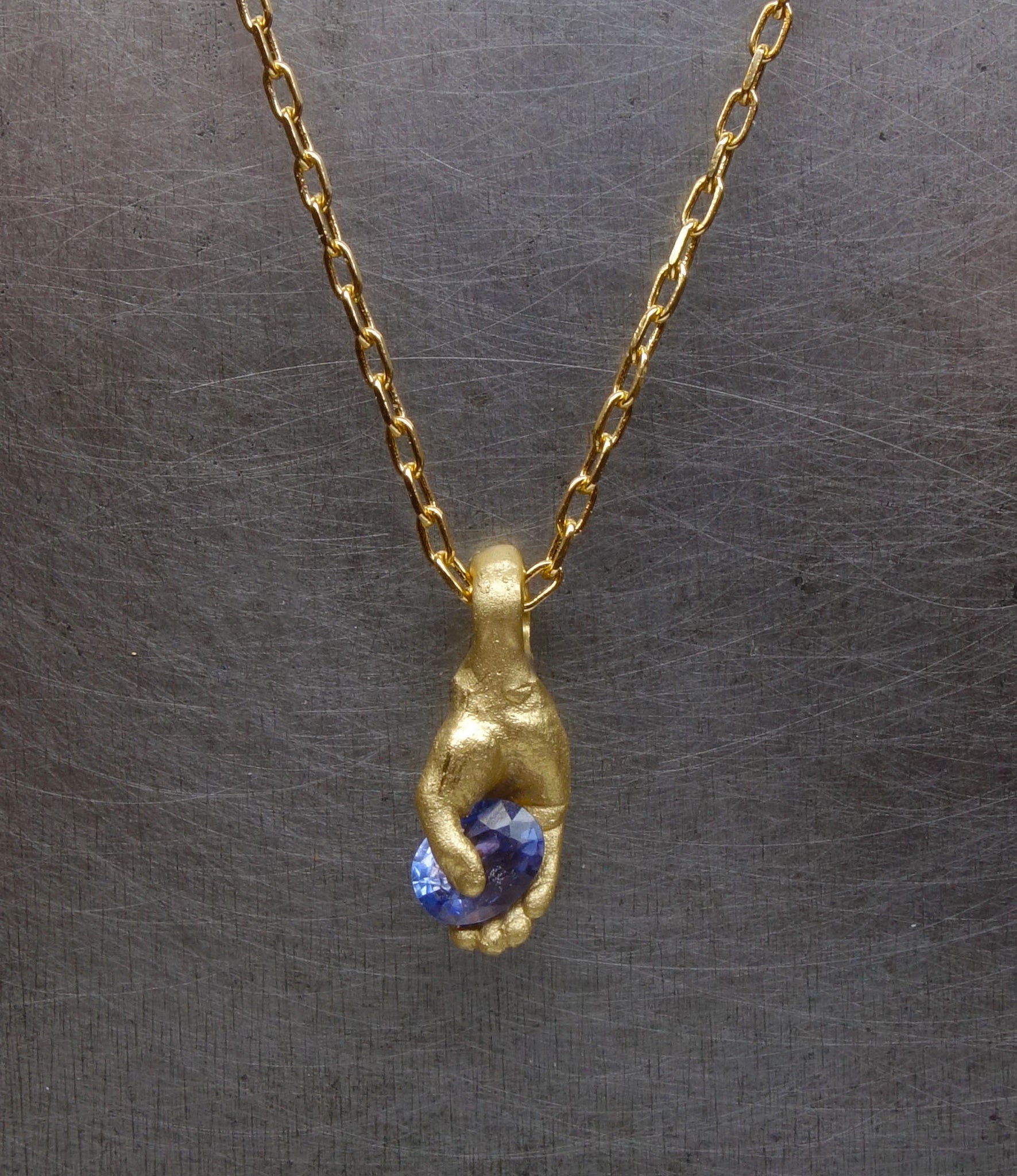 Handmade by Fraser Hamilton, the Hand Pendant, a finely-detailed hand clasps an exquisite natural sapphire and presents it to the beholder. Available now and ready to ship. Each pendant is unique with subtle differences in the angle shape and colour of the gemstone.