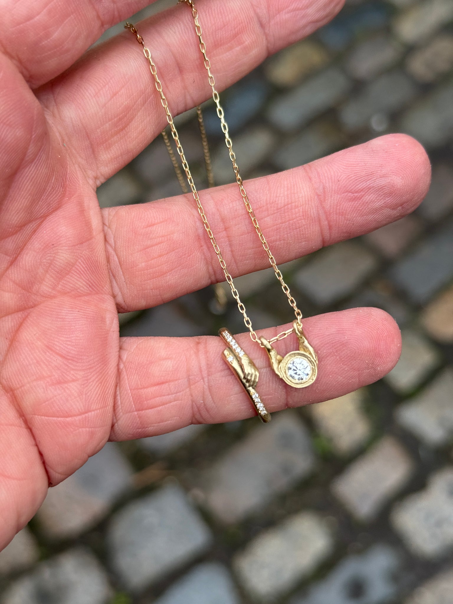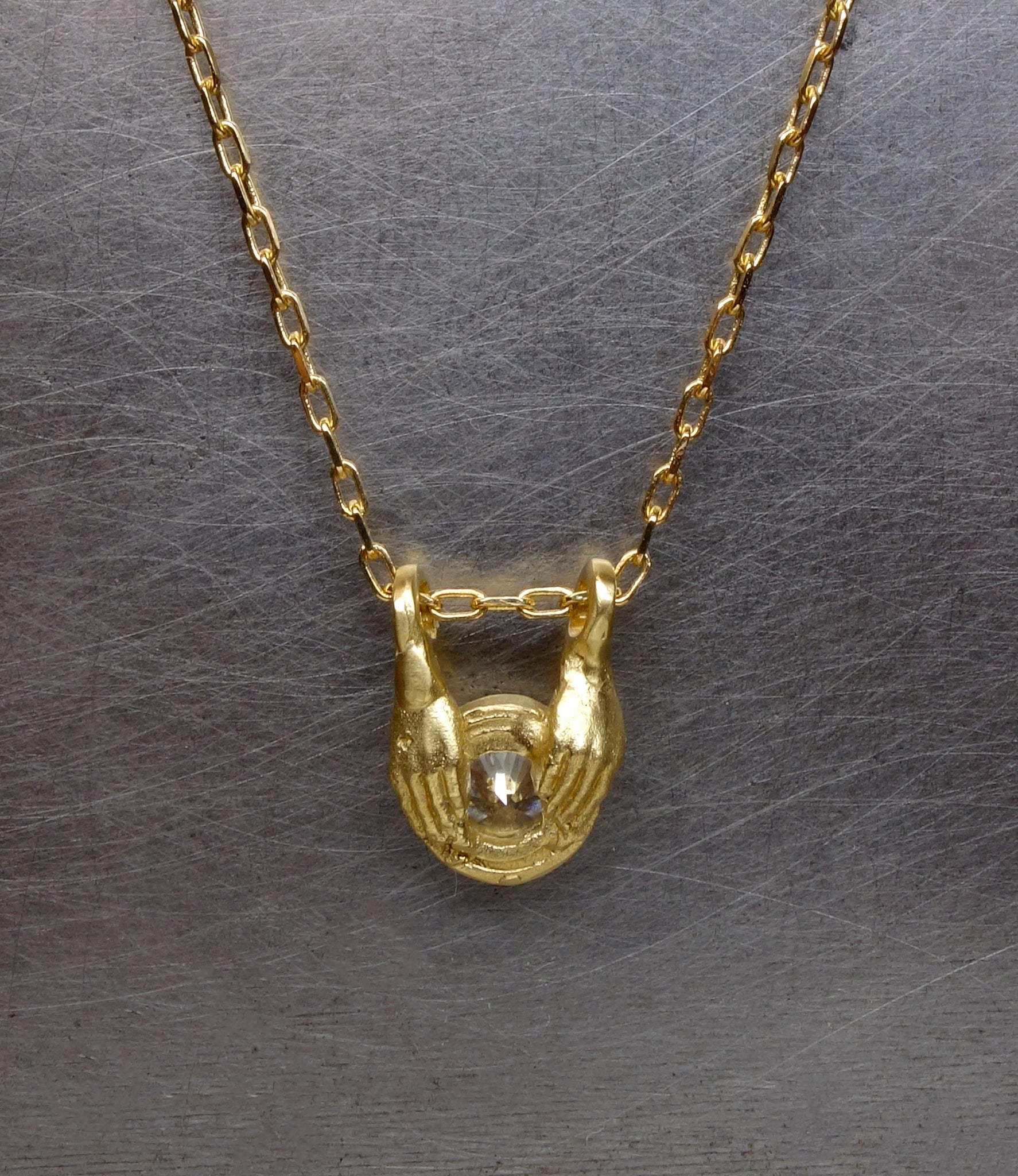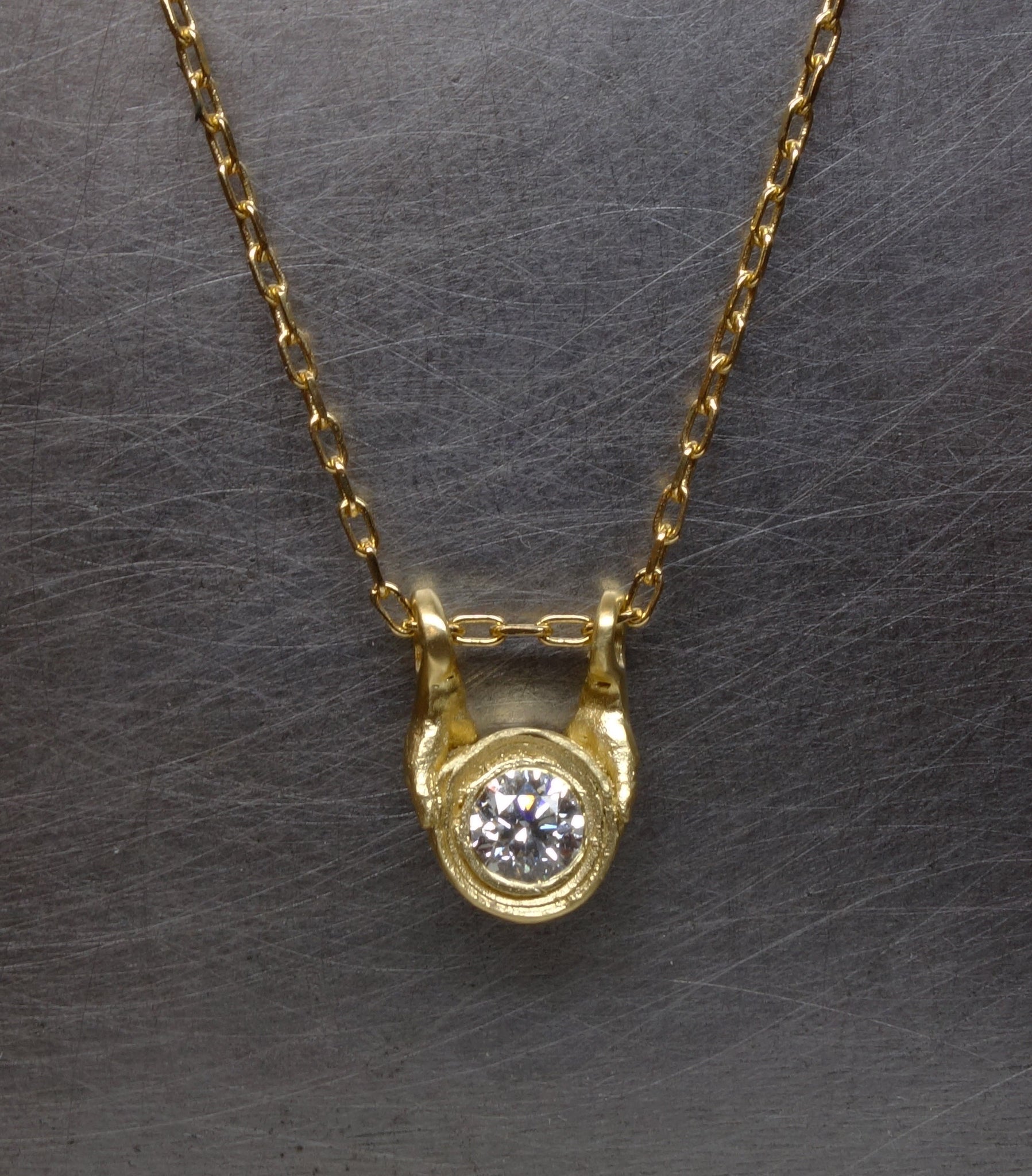 A gorgeous diamond is bound in gold and presented by a pair of finely detailed hands - this style can be created with an alternate stone and colour, just get in touch to discuss options.