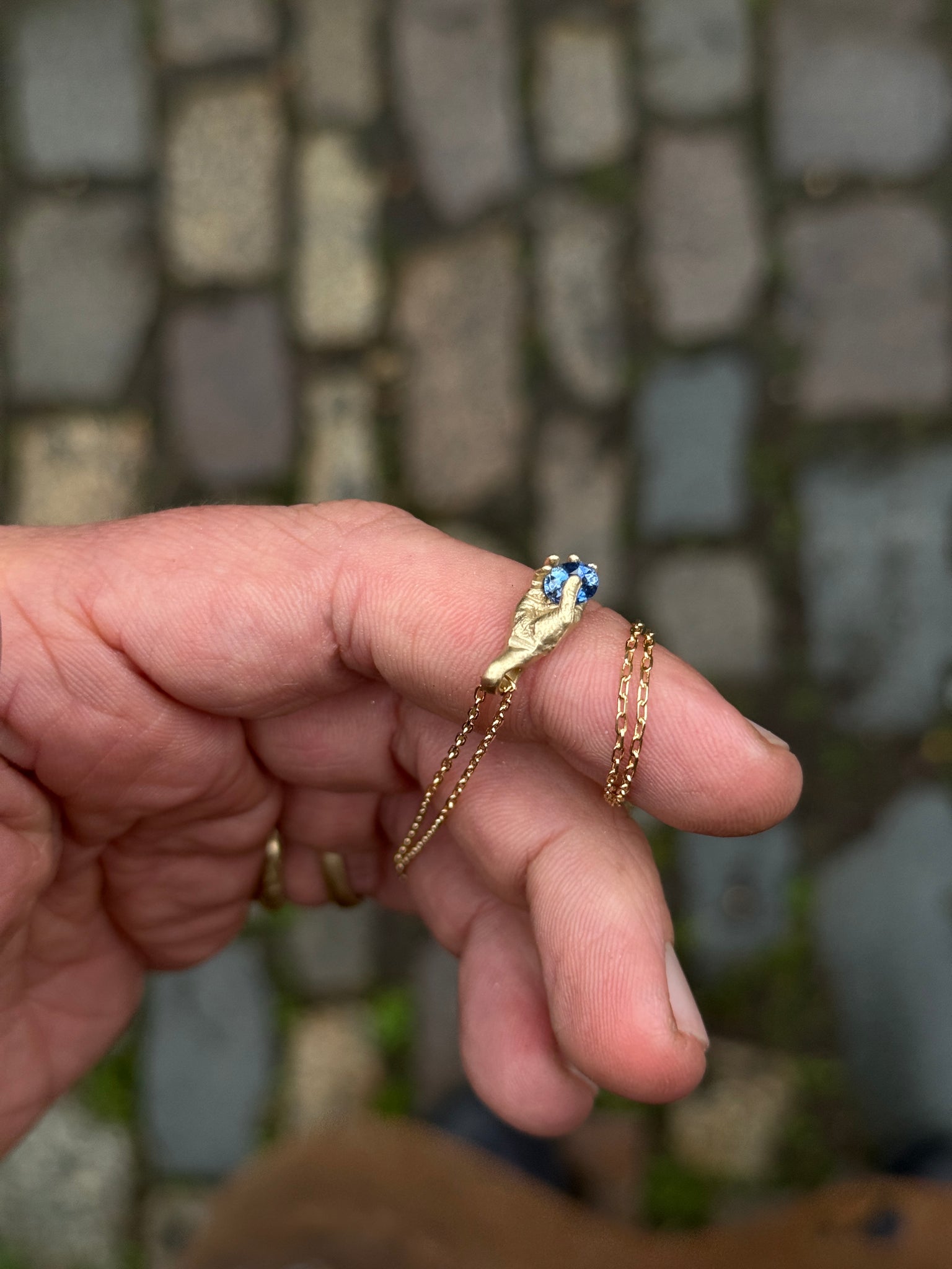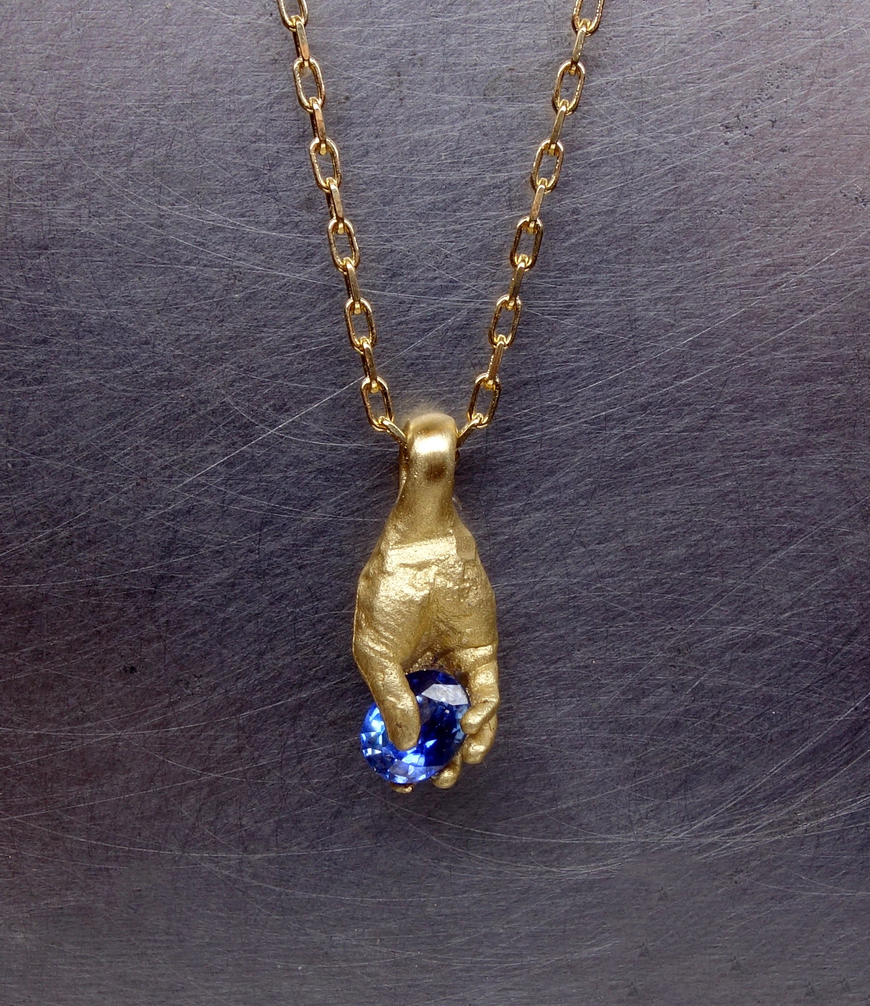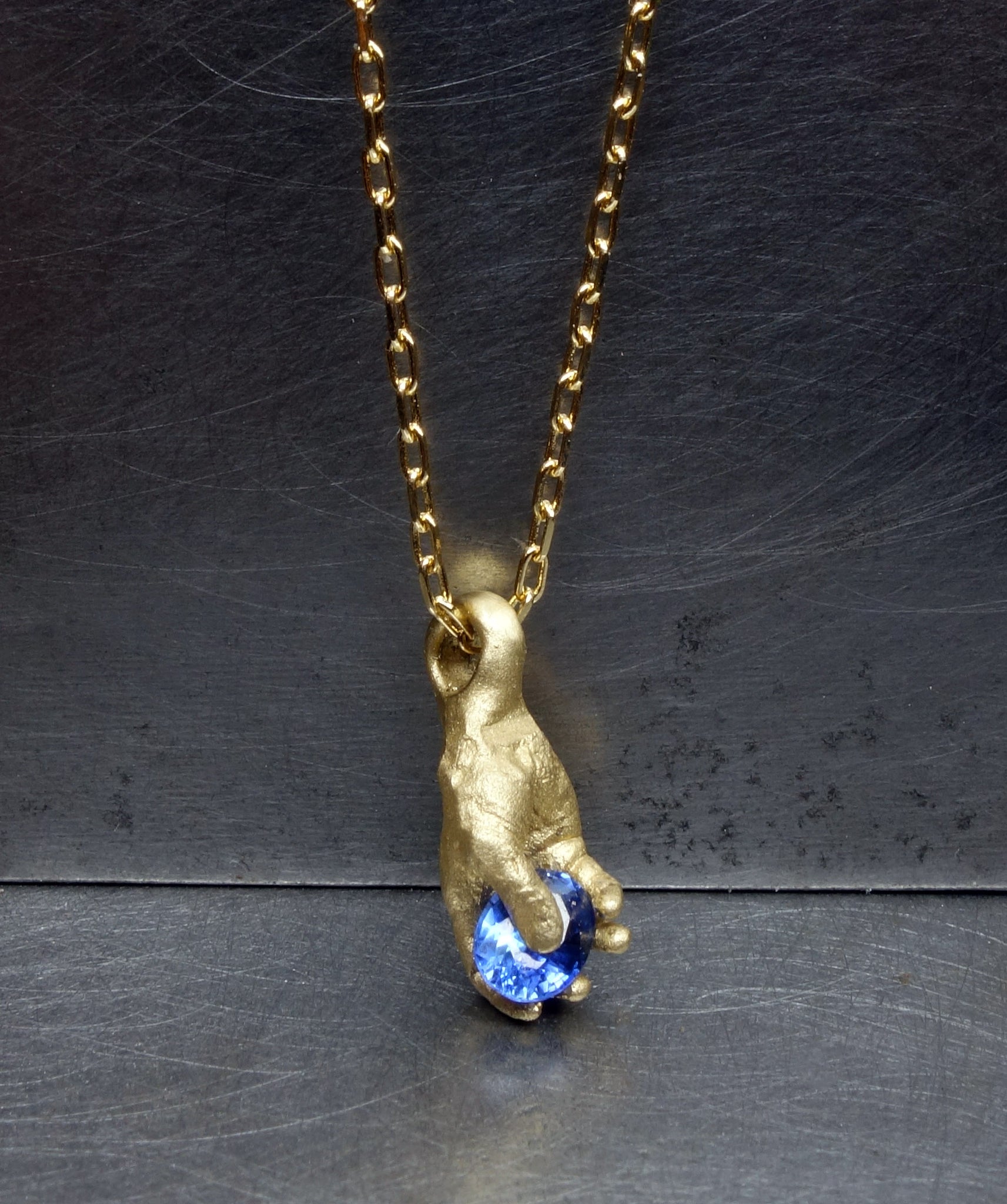 Handmade by Fraser Hamilton, the Hand Pendant, a finely-detailed hand clasps an exquisite natural sapphire and presents it to the beholder. Available now and ready to ship. Each pendant is unique with subtle differences in the angle shape and colour of the gemstone.