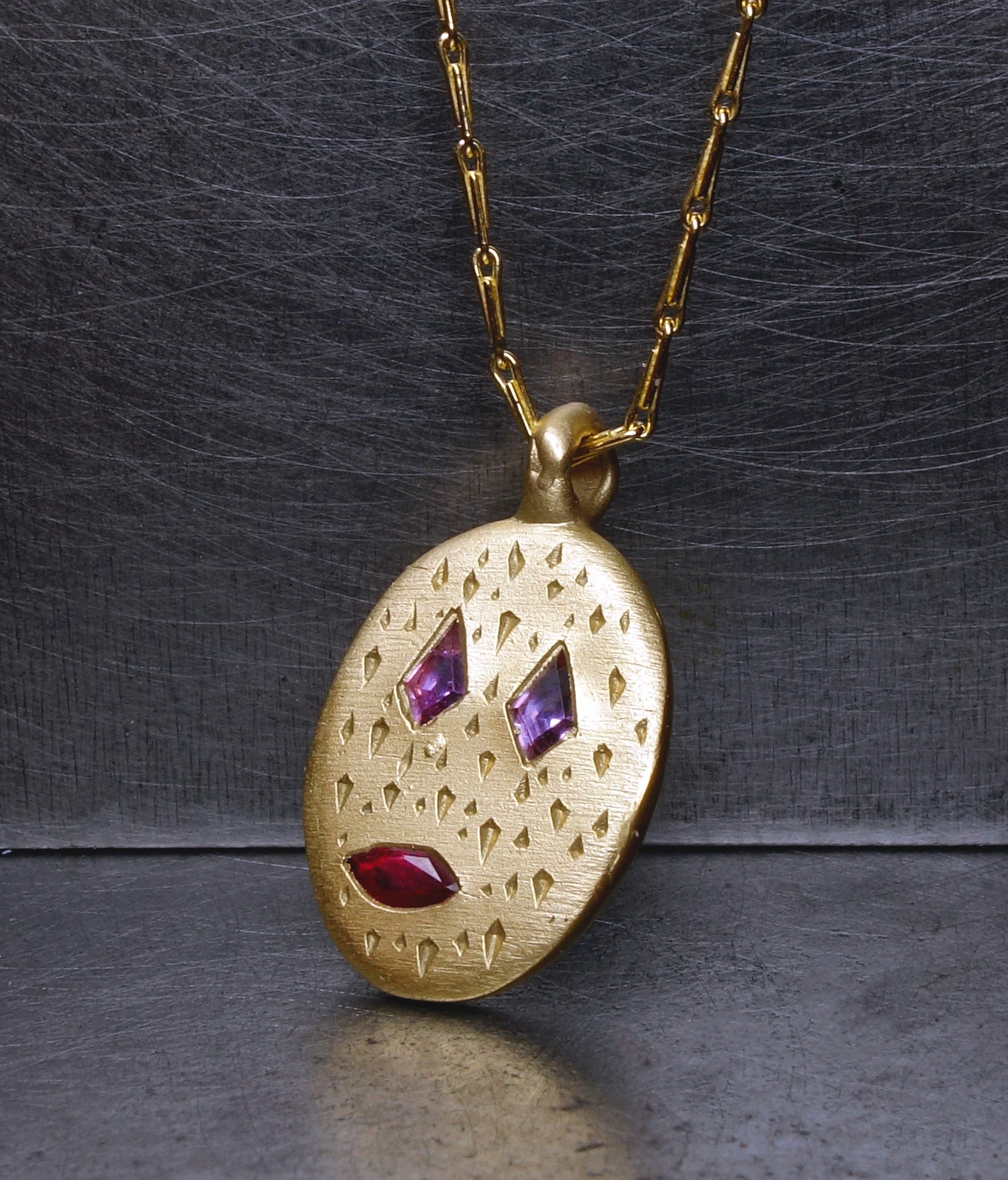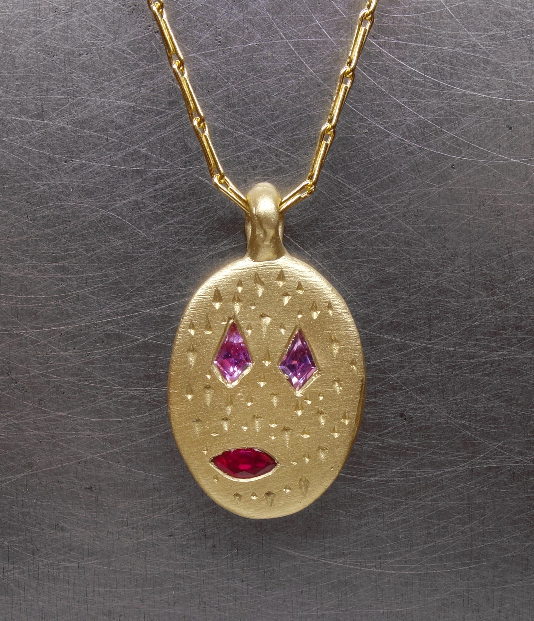 Handmade by Fraser Hamilton, this pendant is a very new sapphire mask featuring a unique anthropomorphic arrangement of three unique sapphires.